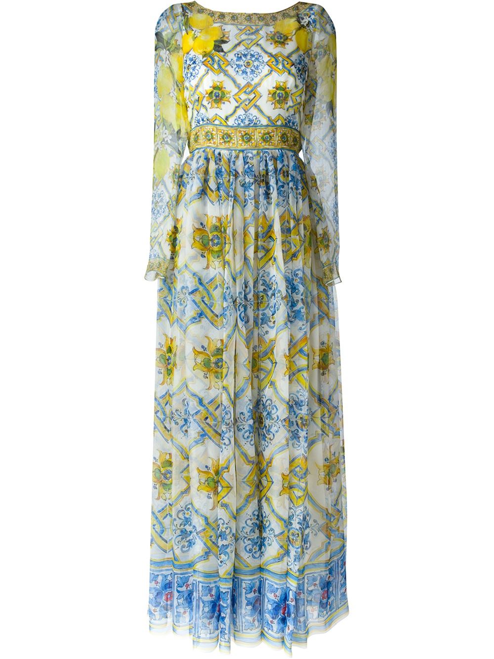 Dolce & Gabbana Sleeveless Maiolica Floral-Print Shift Dress, White/Blue/Yellow